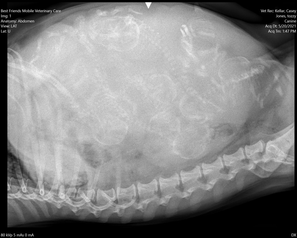 We generally like to get an x-ray one week before they are due. This way we can get a count, though sometimes it isn’t exact because someone can be hidden under something. Also we can be sure no one is too large to fit through the pelvis.