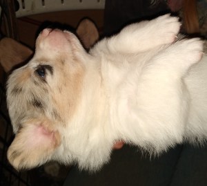 Puppy coats are soft and fluffy but change both in texture and color as they age. For instance, tri colors are born black and white. By 2 weeks the tan has begun to show on their cheeks and above their eyes. They will continue to get more and more red on their faces, shoulder and hips. That is, if they are a red headed or a capped tri. Black headed tris only get a little tan on their cheeks, above eyes, and it is a solid color brake on their legs and bum. Capped tris colors blend where they meet, and generally the have more red or tan than a black headed tri. It’s difficult to say at this point if the puppies will be black headed tri. As far as genetics, have 70% chance of of black headed tris. 50% chance of red headed tris. As they get older it will be easier to tell.