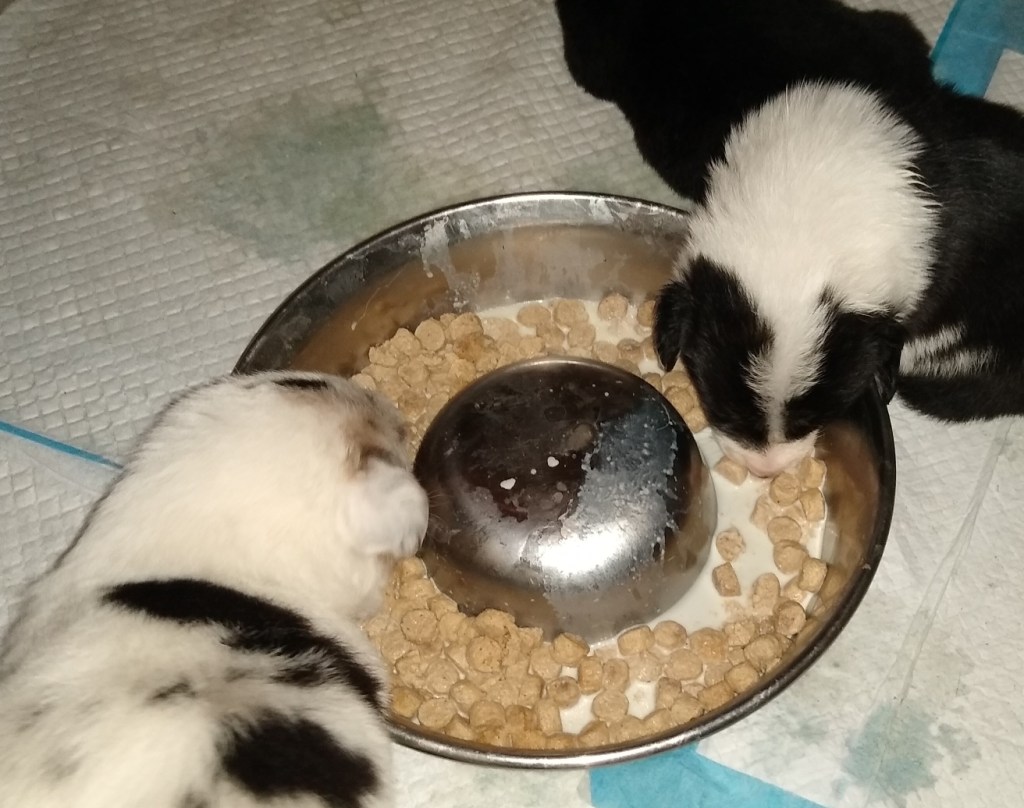 Earlier I mentioned that their ears have opened up. They can hear, and this is a great time to use there names or teach them other words for coming, like “puppy, puppy”. This helps in identifing their name with themselves, or as a group with the puppy call. I do this when I bring them their food.