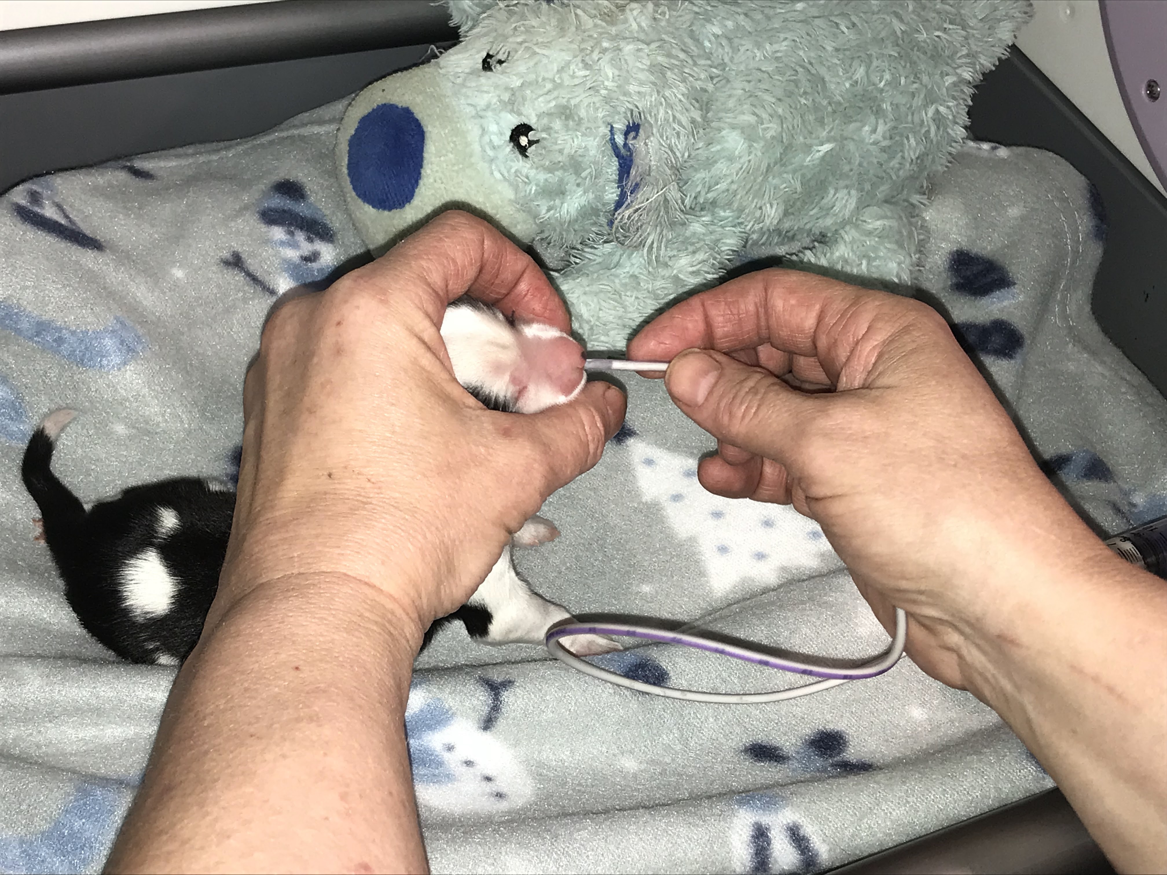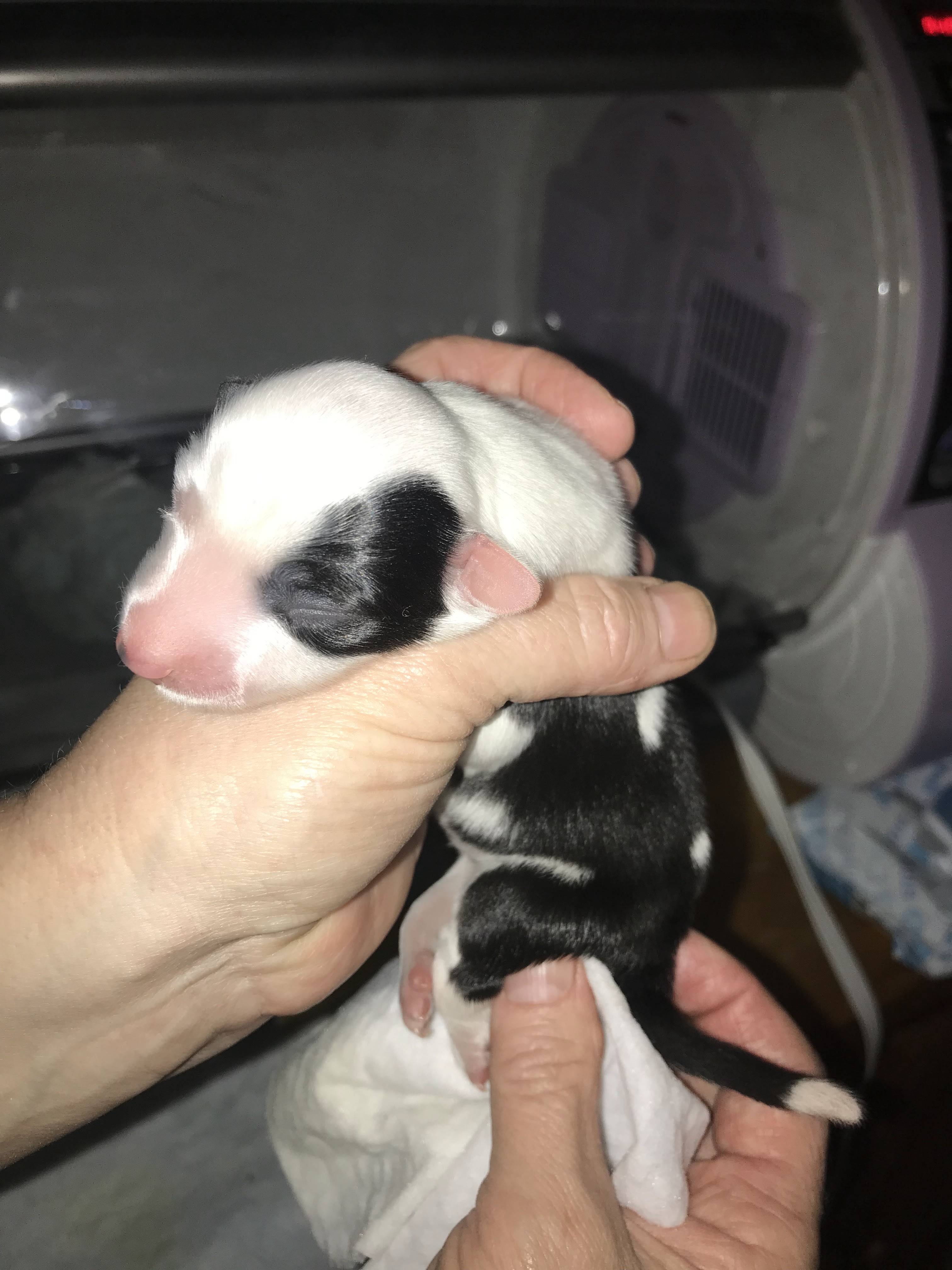 Little Specs is doing well. Here’s some pictures of her getting pottied (in case you didn’t know, very young puppies can’t do that on their own!) and tube fed. She doesn’t have good “suck” which means she can’t latch onto mom’s teat and get milk out very well. We help her along with the stomach tube which is safer than a baby bottle for puppies in her condition. She is currently spending most of her time in the incubator, but we put her in with her litter mates periodically for the comfort and socialization that provides.
