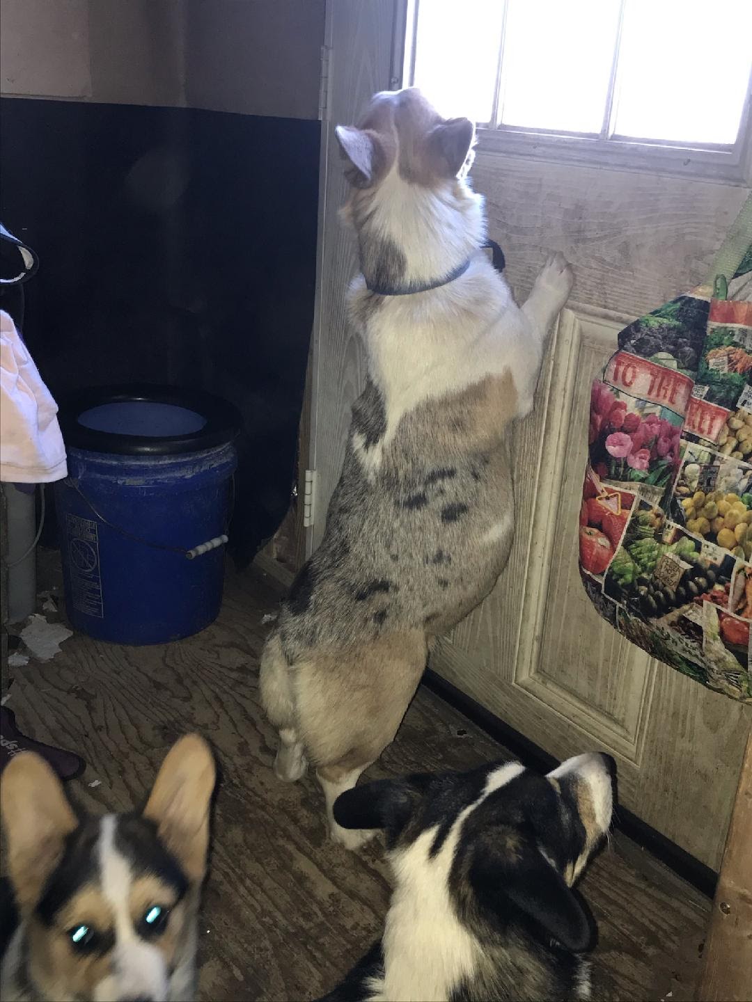 Step #1 Everyone is in their places: Brother is in study working on computer. Big, older Labrador is laying in the hall fast asleep. Sister is in the kitchen making dinner. Fred the corgi is in the living room staring out the window, tense, whining a little.